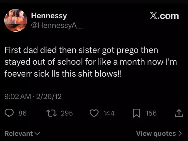 Among the tweets resuming from 2012, says a posted by Hennessy, “Ima be an aunt of a girl <3 lls" and another message from 2012 refers to intense family struggle, "first father died since sister got prego and then stayed from school for a month now i am forever sick lls this shit!" These posts indicate that Cardi's sister implied Cardi B became pregnant at 18 years.